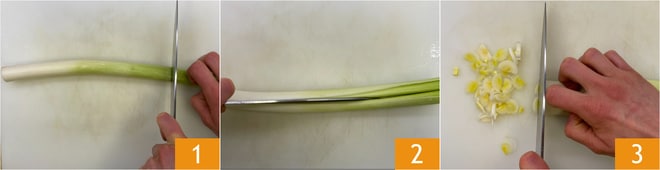 Para preparar los risoni con puerros, robiola y avellanas, lo primero que debéis hacer es ocuparos de los puerros. Eliminad las raíces y las partes verdes 1, con estas últimas podéis preparar un caldo de verduras. Cortad los puerros por la mitad 2 y luego en rodajas muy finas 3.