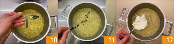 Añadid la salvia 10 y llevad a cocción. Eliminad la salvia 11 y, fuera del fuego, incorporad la robiola 12.