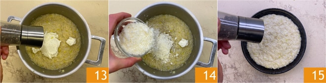 Añadid la pimienta 13, el Parmigiano rallado 14 y mantecad. Emplated e insaporid con otra pizca de pimienta 15.