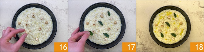 Completar con las avellanas 16, algunas hojas de salvia frita 17 y un chorrito de aceite en crudo. ¡Los risoni con puerros, robiola y avellanas están listos para ser degustados 18!