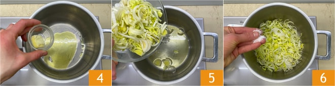 En una olla verted el aceite y añadid una nuez de mantequilla 4 y los puerros 5. Ajustad de sal 6 y dejad estofar durante al menos 5 minutos.