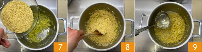 Cuando los puerros estén tiernos, añadid los risoni 7, dad una vuelta 8 para tostarlos rápidamente, luego bañar con caldo de verduras 9 hasta cubrir.