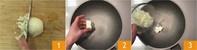 Para preparar el risotto a la milanesa sin médula deberás tener listo aproximadamente 1 litro de Caldo de carne clásico, que debes mantener siempre muy caliente. Limpia y pica finamente media cebolla blanca 1. En una sartén amplia, vierte 25 g de mantequilla 2 y luego la cebolla picada 3. Deja que se poche a fuego medio, removiendo de vez en cuando para que se ablande.