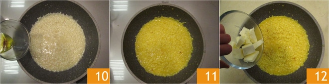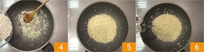 Una vez dorada, podrás añadir el arroz Carnaroli 4: el arroz absorberá la mantequilla y se mezclará con la cebolla. Cuando esté tostado y translúcido 5, podrás desglasar con el vino blanco 6. Deja evaporar la parte alcohólica por unos instantes.