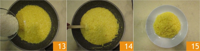 Vierte también el Parmigiano Reggiano DOP rallado 13, mezcla vigorosamente 14, de manera que la mantequilla y el queso bien fríos creen el choque térmico que favorecerá la cremosidad y el brillo del risotto. Sirve el risotto a la milanesa sin médula bien caliente 15!