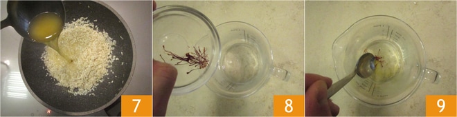 Vierte el caldo muy caliente hasta cubrir y continúa la cocción a fuego alto, añadiendo caldo caliente según sea necesario 7. Introduce suavemente los pistilos en agua caliente 8, remueve apenas para que se rehidraten 9.