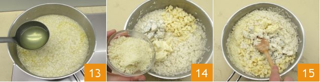 Lleve el risotto a cocción añadiendo el caldo poco a poco 13, esperando que el líquido se absorba antes de añadir más, y removiendo a menudo con una cuchara de madera, tardará unos 18-20 minutos. Una vez que el risotto esté listo, retírelo del fuego e incorpore todos los quesos previamente cortados, además del Grana rallado 14. Remueva para derretir los quesos 15,