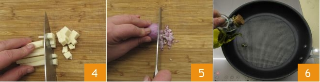 y reduzca también este a cubos 4. Luego, pele y pique la chalota 5, en una sartén vierta el aceite 6