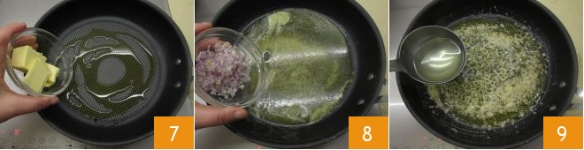 y la mantequilla 7 y caliéntelos a fuego moderado, luego vierta la chalota picada 8 y déjela rehogar a fuego lento durante unos minutos. Agregue un cucharón de caldo 9 y reserve.