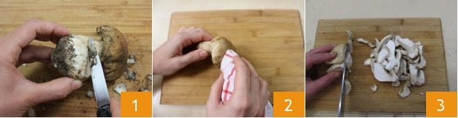 Para preparar el risotto con porcini y azafrán, comenzad a realizar el Caldo de verduras; una vez listo, dedicad vuestro tiempo a la Cómo limpiar los boletus. Ayudándoos con un cuchillo pequeño, eliminad la tierra en exceso del tallo 1, luego limpiadlas con un paño húmedo 2. En este punto, cortad las setas porcini en rodajas finas 3.