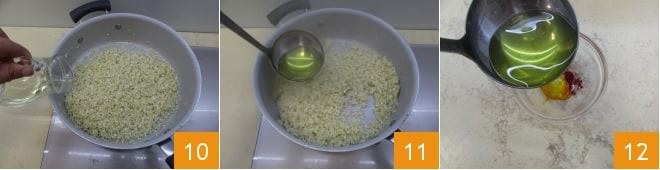 Una vez que el arroz haya cambiado de color, rociadlo con el vino blanco 10, añadid un cucharón de caldo 11 y continuad la cocción mezclando a menudo y añadiendo más caldo según sea necesario. Verted el azafrán en un vaso y disolvedlo añadiendo un cucharón de caldo caliente 12.