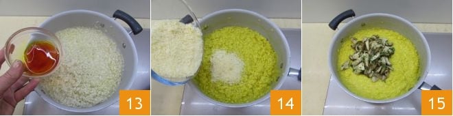 Unid el azafrán al risotto solo hacia el final de la cocción 13 y continuad mezclando para amalgamarlo bien. Una vez cocido el arroz, ajustad de sal y pimienta, apagad el fuego, mantecad con el queso parmesano 14 y añadid finalmente las setas porcini 15. Mezclad nuevamente y servid vuestro risotto con porcini y azafrán aún humeante!