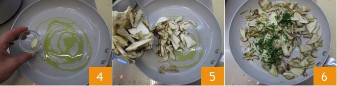 Verted el aceite en una sartén, añadid el diente de ajo 4 y dejadlo dorar a fuego lento. Agregad las setas porcini 5 y cocinad durante unos minutos, mezclando a menudo y con mucho cuidado, para no romperlas. Hacia el final de la cocción, ajustad de sal, espolvoread con el perejil finamente picado 6 y continuad la cocción durante otros 5 minutos a fuego bajo.