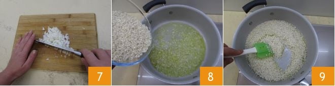 Reservad las setas y ocupaos de realizar el risotto. Limpiad la cebolla, picadla finamente 7 y transferidla a una cacerola junto con un chorrito de aceite. Dejadla dorar suavemente 8, luego añadid el arroz y dejadlo tostar, mezclando a menudo 9.