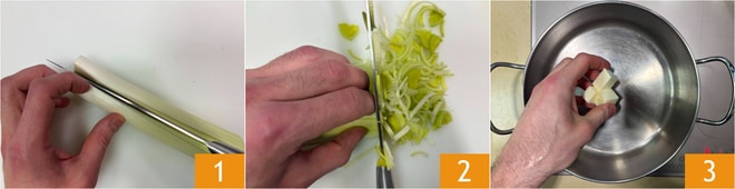 Para preparar el risotto de puerros, lo primero que debéis hacer es eliminar la parte verde de los puerros y las raíces. Cortadlos primero a la mitad 1 y luego finamente 2. En una cacerola, derretid la mantequilla 3.