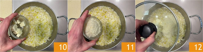 Apagad el fuego, añadid la mantequilla 10, el queso 11 y cubrid con la tapa 12 hasta que la mantequilla se haya derretido.