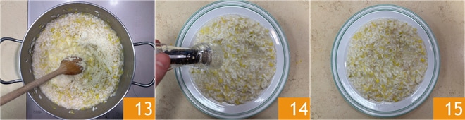 Mantecad 13 hasta obtener una consistencia cremosa, luego emplatad y completad con una pizca de pimienta negra 14. Vuestro risotto de puerros está listo para ser disfrutado 15.