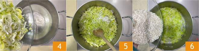 Agregad los puerros 4 y sofreídlos a fuego medio hasta que estén tiernos y ligeramente dorados 5. Añadid el arroz 6 y ajustad de sal.