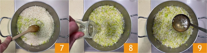 Tostad durante unos 2 minutos, removiendo continuamente 7, hasta que los granos se vuelvan translúcidos. Desglasad con vino blanco 8 y dejad evaporar toda la parte alcohólica. Añadid el Caldo de verduras caliente 9, un cazo a la vez cada vez que el anterior sea absorbido por el arroz, y cocinad durante 15 minutos o hasta que esté al dente.