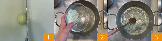 Para preparar el risotto al gorgonzola, preparad el Caldo de verduras y mantenedlo caliente. Limpiad y picad la cebolla 1. Sofreídla a fuego lento con 25 g de mantequilla en una cacerola 2 hasta que se ablande 3, tomará unos 10 minutos.