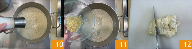 Salad 10, añadid la cebolla que habíais reservado 11, y llevad el risotto a cocción, añadiendo caldo vegetal según sea necesario. Mientras tanto, cortad el gorgonzola en trozos 12.