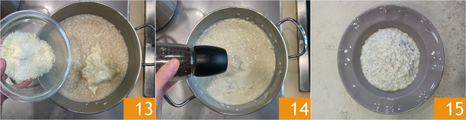Al final de la cocción, apagad el fuego y añadid el gorgonzola y el Parmigiano Reggiano DOP para mantecar 13. Terminad con pimienta molida al momento, al gusto 14. El risotto al gorgonzola está listo para ser servido 15.