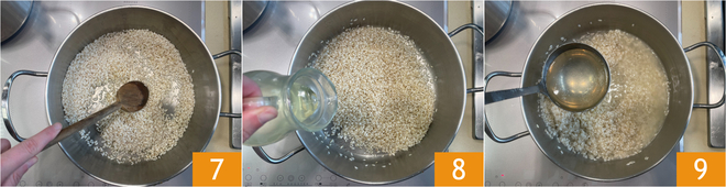 Tuestad el arroz a fuego medio, removiendo a menudo 7, luego añadid el vino blanco 8, dejad que se evapore e iniciad la cocción con uno o dos cucharones de caldo vegetal caliente hasta cubrir 9.