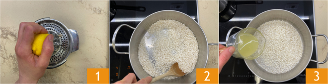 Para preparar el risotto de limón con queso de cabra y romero, empezad por los limones. Después de lavarlos y secarlos, rallad la piel y luego exprimid el zumo, filtradlo obteniendo así 80 gramos 1. Mientras tanto, poned a tostar el arroz en una cacerola 2 y tras un par de minutos, desglasad con el zumo de limón 3.