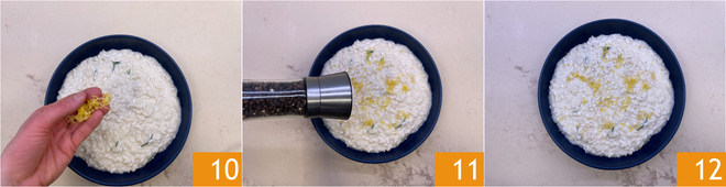 Emplatad y adornad con la ralladura de limón 10 y una pizca de pimienta 11. Aquí tenéis listo vuestro risotto de limón con queso de cabra y romero, ¡disfrutadlo inmediatamente 12!