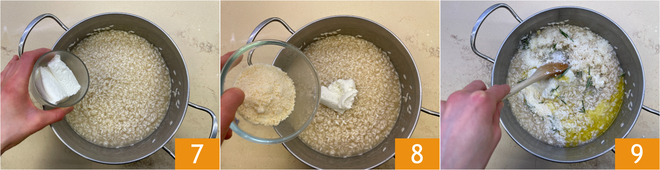 Al final de la cocción, mantecad incorporando el queso de cabra 7 y el pecorino romano rallado 8; añadid también el aceite, el romero y mezclad bien 9.