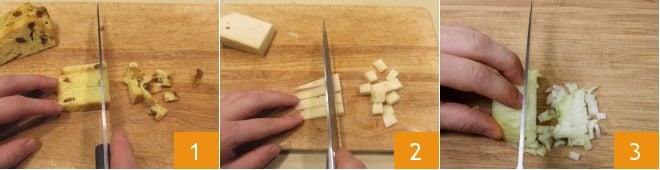 Para realizar el risotto al panettone cortad en pequeños cubos el panettone 1 y la fontina 2 y reservadlos, pelad y picad finamente la cebolla 3,