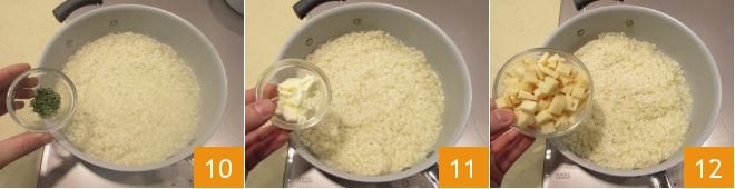 Una vez cocido, apagad el fuego aromatizad con las hojas de tomillo fresco 10, mezclad con la mantequilla en trozos 11 y para terminar condimentad con los cubos de fontina 12