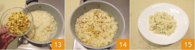 y de panettone (13-14); mezclad con una cuchara para que la fontina se derrita sazonando el risotto. ¡Servid el risotto al panettone bien caliente 15!