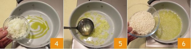 calentad un chorrito de aceite de oliva en una cacerola, añadid la cebolla picada 4 y dejadla pochar a fuego lento luego verted un cucharón de Caldo de verduras 5 y después de un par de minutos agregad también el arroz 6.