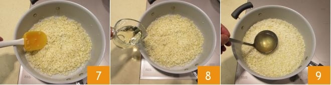 Tostad el arroz durante unos minutos 7 luego añadid el espumante o vino blanco 8. Continuad la cocción vertiendo el caldo 9, un cucharón a la vez hasta que el arroz esté cocido: tomará unos 20 minutos.