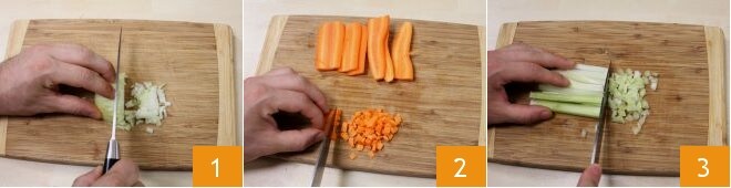 Para preparar el risotto de perca, empieza con el Caldo de pescado, utilizando los restos de la perca. Una vez listo, procede con la preparación del sofrito. Lava y pela las zanahorias, la cebolla y el apio, luego pícalos finamente con un cuchillo (1-2-3).