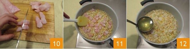 Mientras tanto, corta la perca en trozos de 0,5 cm 10. A mitad de cocción, añade al arroz la mitad de la perca 11; continúa la cocción con el caldo, salando y pimienta ligeramente 12.