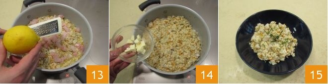 Casi al final de la cocción (unos 5 minutos antes), añade los trozos de perca reservados y añade la ralladura de medio limón 13. Al finalizar la cocción, mezcla con la mantequilla en cubos 14 y sirve tu risotto de perca bien caliente 15!