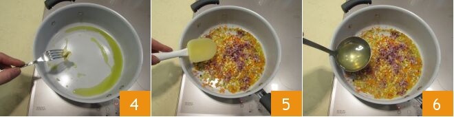 Calienta en una sartén bastante grande el aceite con el diente de ajo y, tan pronto como se dore, retíralo con la ayuda de un tenedor 4. Luego añade las verduras finamente picadas, mezcla 5 y déjalas cocer a fuego lento durante unos minutos añadiendo un cazo de caldo 6.