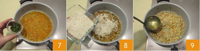 Una vez evaporado, añade las hierbas aromáticas finamente picadas 7. Incorpora el arroz y déjalo tostar durante un par de minutos 8, luego desglasa con el vino blanco y continúa la cocción añadiendo poco a poco el caldo 9.