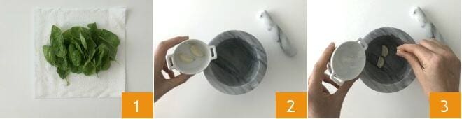 Para preparar el risotto patatas y pesto, realizad el pesto: limpiad las hojas de albahaca con papel de cocina 1, poned dos dientes de ajo pelados y sin germen dentro del mortero 2, añadid una pizca de sal 3