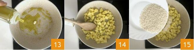 En una sartén, verted un diente de ajo pelado y entero, el aceite 13 y dorad el diente de ajo. Retirad el ajo y añadid las patatas 14, doradlas durante unos segundos y luego añadid el arroz 15,