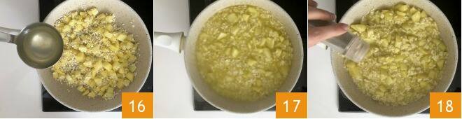 tostadlo rápidamente y verted el caldo de verduras poco a poco 16, llevad el risotto a cocción 17 espolvoreando con pimienta 18, tomará unos 12 minutos para que esté al dente.