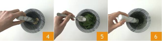 y, con el mazo, machacad bien hasta que el ajo se haya reducido a crema 4. Añadid entonces la albahaca, agregad otra pizca de sal 5 y machacad bien la albahaca contra las paredes del mortero para triturarla bien 6.