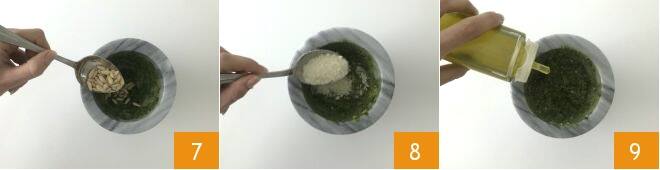 Añadid los piñones 7, machacadlos y luego añadid el Parmesano rallado 8. Verted finalmente el aceite 9