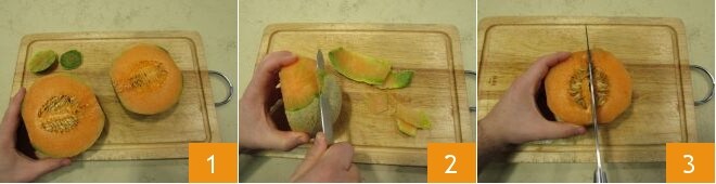 Para preparar el risotto con jamón y melón, comienza cortando ambos extremos del melón y partiéndolo por la mitad 1. Retira la piel externa con un cuchillo 2 y divide nuevamente cada mitad en 2 partes iguales 3.