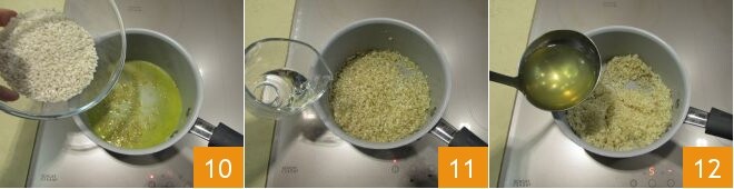 Cuando esté pochado, añade el arroz 10 y deja tostar unos minutos. Luego, añade el vino blanco 11. Cuando el vino se haya evaporado, añade un cucharón de Caldo de verduras 12. Remueve de vez en cuando el risotto y sigue añadiendo un cucharón de caldo, solo cuando el anterior haya sido totalmente absorbido.