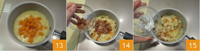 Casi al final de la cocción, agrega el melón 13 y el jamón 14, reservando algunos trozos para la decoración final, y mezcla todo. Una vez cocido el risotto, retíralo del fuego y añade la stracciatella para mantecar 15, continuando a remover hasta que se derrita, de modo que el risotto quede cremoso.