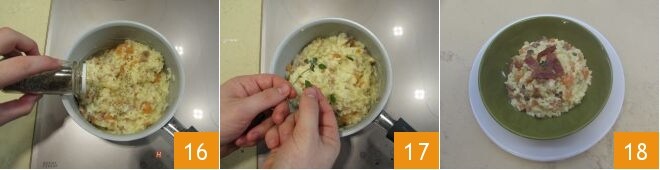Ajusta de sal y pimienta 16. Enjuaga las hojas de mejorana y añádelas al risotto para aromatizarlo 17. Ahora emplata, decora con algunas tiras de jamón reservadas y disfruta de este original risotto con jamón y melón 18!