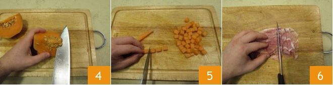 Quita la parte interna con las semillas 4 y corta en rodajas no muy gruesas que luego cortarás en dados de aproximadamente medio centímetro 5. Reserva y mientras tanto toma el jamón y córtalo en tiras de aproximadamente 1 cm de grosor 6.
